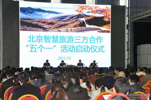 10月30日下午,2012北京智慧旅游“五个一”战略合作发布会在中关村展示中心举行,北京市旅游发展委员会、北京市经济和信息化委员会、中关村管委会共同签署了“北京智慧旅游‘五个一’战略合作协议书”。会上,趣游科技等4家企业分别与石景山游乐园等旅游单位签署智慧旅游项目合作协议。各区县旅游委、旅游行业和科技领域的专家学者、旅游企业管理者、科技企业精英、新闻媒体等200余人出席发布会。
